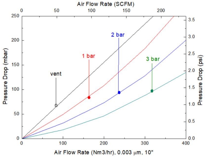 *測(cè)試氣體為壓縮空氣,測(cè)試壓力vent,1bar,2bar,3bar為出口壓力。