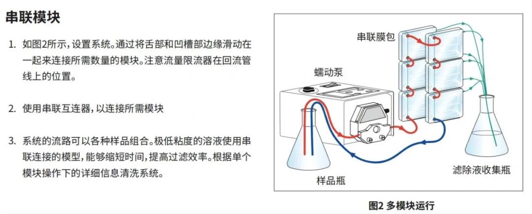 PRISM 50的模塊化設(shè)計(jì)使多個(gè)模塊串聯(lián)操作。這將最大吞吐量提高到3升,并與膜面積成比例地加快處理速度(見下圖)。